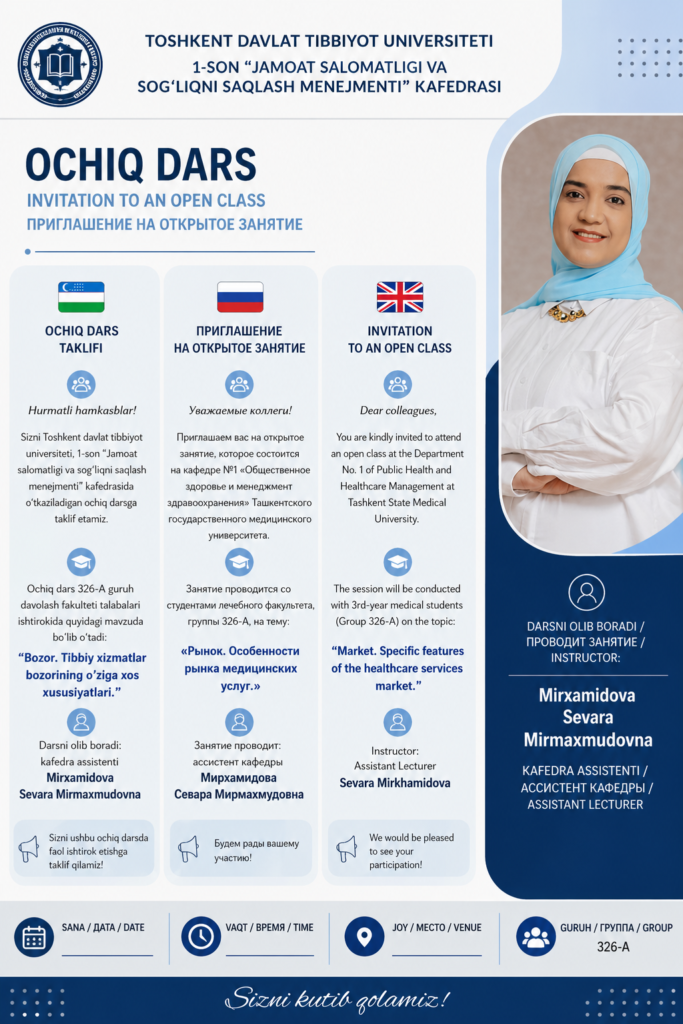 You are kindly invited to attend an open class at the Department No. 1 of Public Health and Healthcare Management at Tashkent State Medical University.